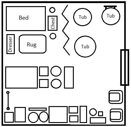 Their private furnishings include the bed, dresser that doubles as a desk, rug, chest that doubles as a table, and two stools. The three tubs (two smaller - one with wheels and a handle - and one larger) are separated by a folding screen from the private area. A single heating stone can be moved from under one tub to the other to keep the water at least tepid for either bathing or clothes washing. The south side of the room is filled with boxes, barrels, and crates containing a wide variety of gear, weapons, and not-too-valuables for the residents and community as a whole (there is a fairly good chance most common and uncommon items) as well as some currently unneeded furniture.