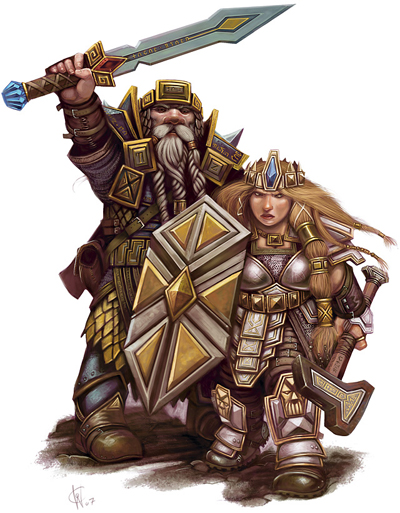 Technical proficiency notwithstanding, the the art shouts "epic fantasy" and "high level adventurers," but the armor's design is lacking. In the same way villains bedecked in black armor bristling with spikes are devoid of personality, so too are armors adorned with baubles and facets. The attempts to add in more dwarven women to the artwork also fall flat when one looks upon the busty breastplates and bare midriffs of a race that is supposedly stocky and fond of meat and mead.