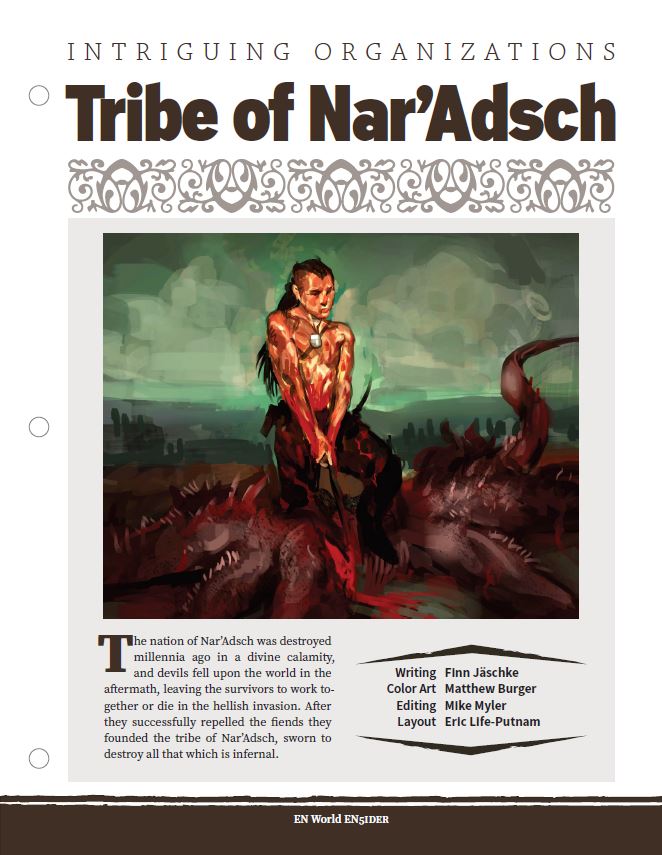 - #257. Intriguing Organizations: Tribe of Nar'Adsch. After their nation was destroyed by a warlock a new society formed from the remains of a nameless kingdom: the Tribe of Nar'Adsch. These survivors and their kin gained an intense hatred for everything infernal, vowing to destroy all that is hellish with no mercy for deviltry of any ilk. They are relentless in their pursuit and have burned down whole villages just to eliminate a single warlock, eschewing the arcane and relying on brute force, skill, or the power of nature to complete their impossible goal. For those that have befriended them however the Tribe of Nar'Adsch can be excellent allies, their powerful druids able to share their spells and the occasional powerful magic item.