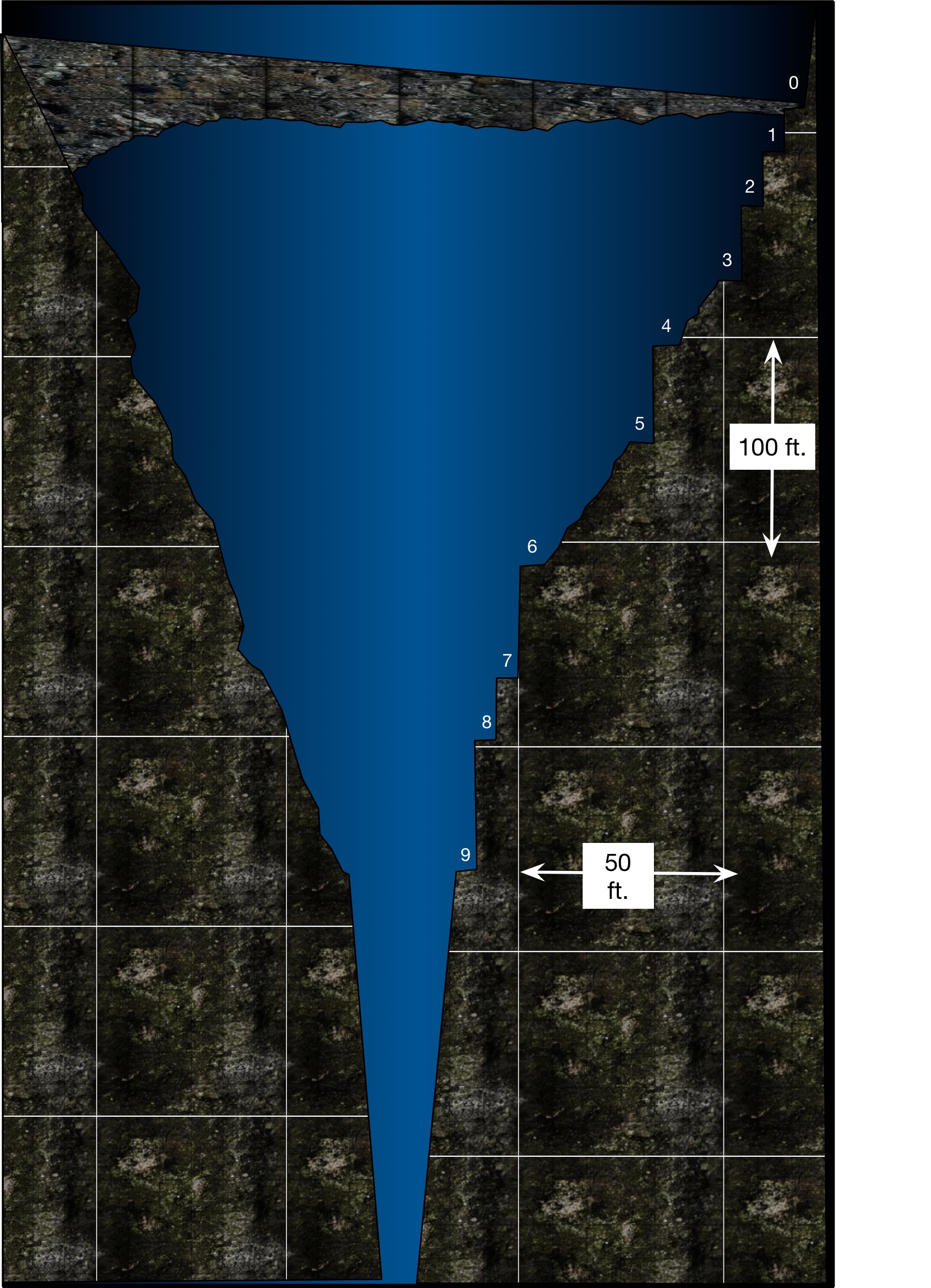 The ravine is 150 feet deep at this point. The characters enter at the top of the map.