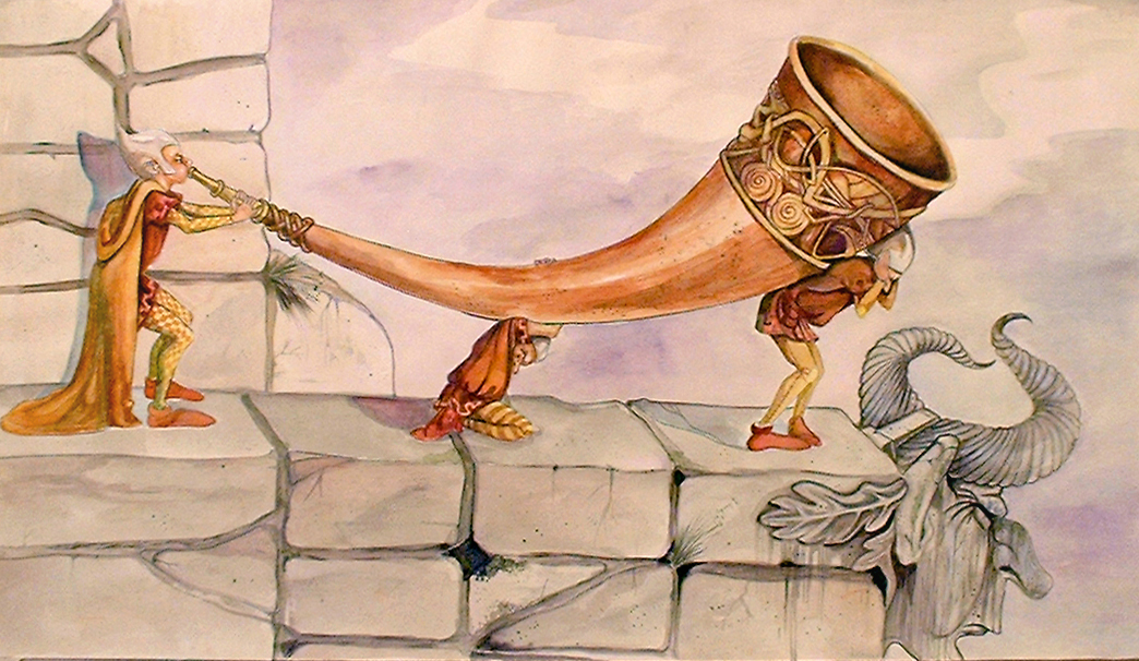 Spread around the courtyard were dozens, maybe hundreds, of other people. Nathan knew them all. There were old classmates, teachers, relatives, neighbors, even some of Jessica’s friends that Nathan only knew through her. Like Nathan and Jessica, they all looked a bit worn and dirty. And like Nathan and Jessica, every single one of them wore stones that weighed them down and impeded them. Some wore them around their waists like Nathan. Others had them on their ankles or their shoulders. Some had the stones draped around their neck. Two days ago, Nathan had been shocked to discover that Jessica was weighed down as he was. Now he found that everyone he knew stood before him with stones of their own. He had no time to speak to them, though, for at this moment, a door halfway up the keep opened and a trio of gnomes emerged with an enormous horn. Two of the gnomes in front bent over, resting the horn on their backs. The third gnome took a deep breath and blew the horn loudly. The walls shook as the horn bellowed.
