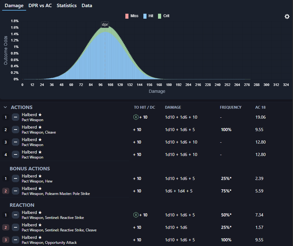 Below is the estimated DPR for this build at 12th level against AC 18. This assumes Hex is cast and that 1st attack in the round has advantage (familiar flyby). DPR is 67.28. FWIW - this is estimated / mapped on DPRcalc.com (seems to be a great site for estimating damage). EDIT: Fixed percentages to be more realistic (but this still makes lots of assumptions and is inherently multi-target damage due to cleave, hew, reactive / opportunity strike, etc...).