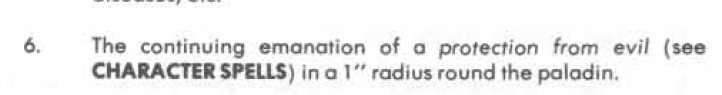 But he's right about the protection downgrade. In 1E all paladins, right from first level, have a continual Protection from Evil 10' Radius on them (a 4th level Cleric spell). "The protection encircles the recipient at a one foot* distance, thus preventing bodily contact by creatures of an enchanted or conjured nature such as aerial servants, demons, devils, djinn efreet, elementals, imps, invisible stalkers, night hags, quasits, salamanders, water weirds, wind walkers, and xorn. Summoned animals or monsters are similarly hedged from the protected creature. Furthermore, any and all attacks launched by evil creatures incur a penalty of -2 from dice rolls ”to hit” the protected creature, and any saving throws caused by such attacks are made at +2 on the protected creature‘s dice." (1E PH p 44 for the spell description)