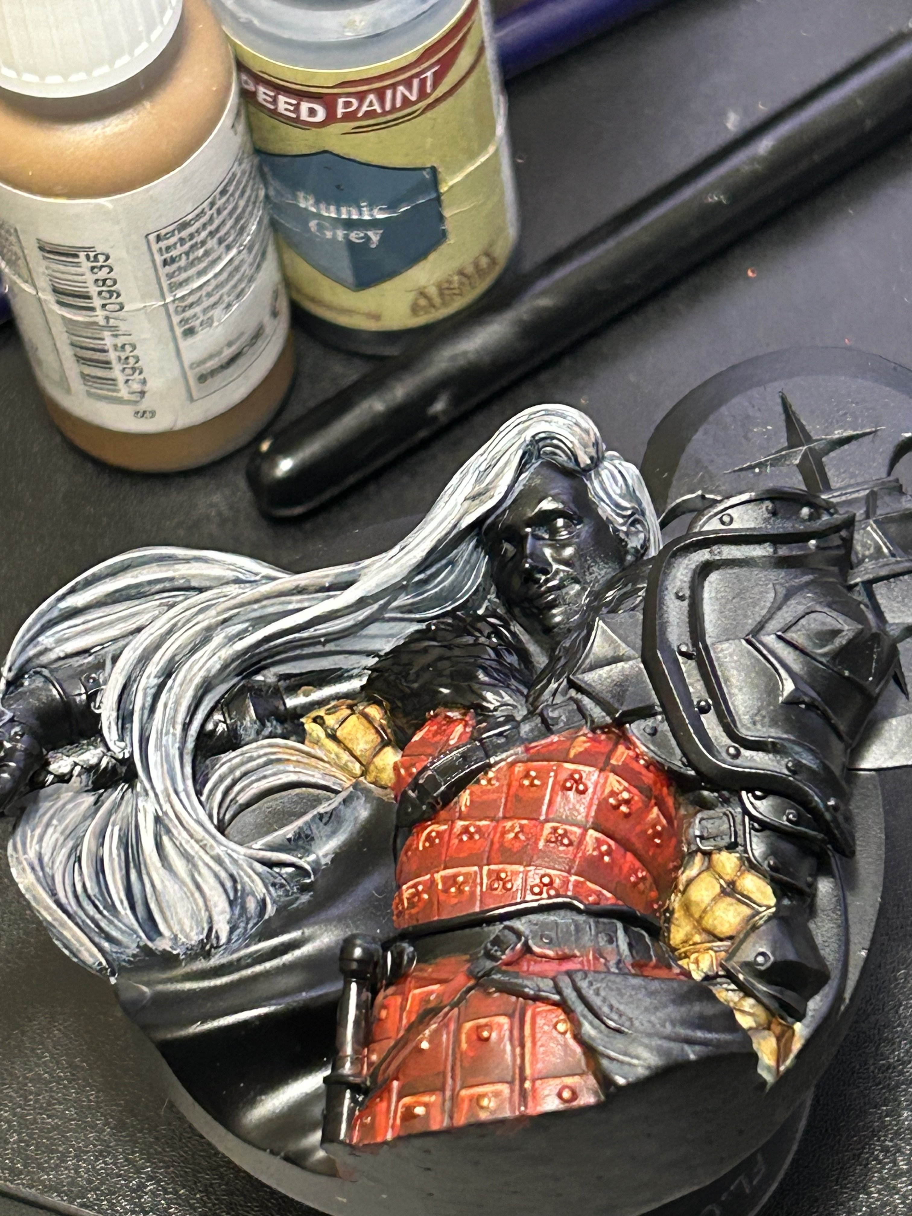 The journey continues. I thought it'd be fun to tackle the hair and there's so much of it this is what the bulk of my time was spent on tonight. I've had mixed success with light colored leather, but I decided to give it a shot for her arms and I'm pretty happy with the results. I might put down one more layer of brown wash to dirty it down a little but I'm not sure I want to take the chance of messing it up. I'm thinking I'll start on the face tomorrow.