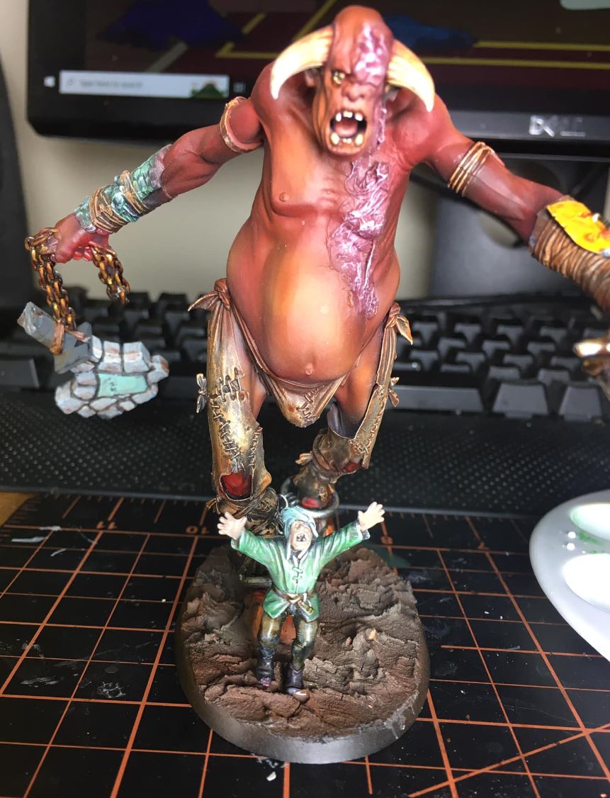 I typically don't paint an entire model with the airbrush alone. With this giant, I painted a lot of the skin with the airbrush but also did a bit of old fashioned brushwork to finish it up and of course his pants, arm braces, etc., etc. were all done with a brush. Once you get used to using it, an airbrush can really save you some time when you're painting larger models like monsters and vehicles.