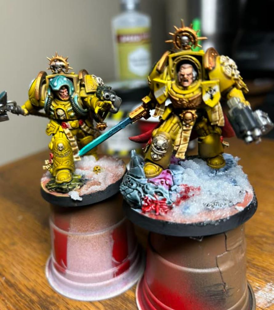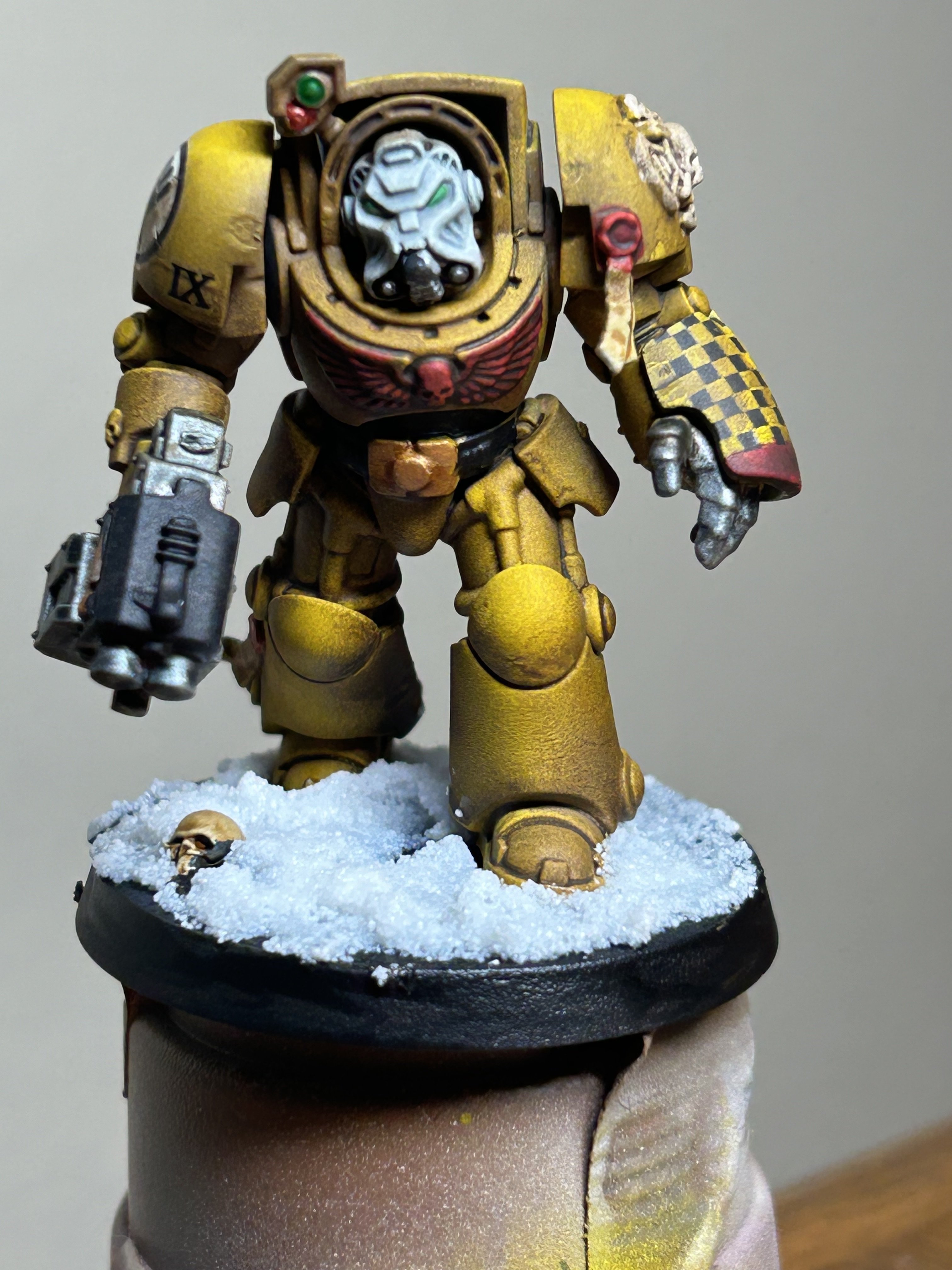 And here's an Apothocary Biologis from Warhammer 40k. So, I didn't know until after I painted this that it wasn't just a regular Apothocary figure. The Apothocary Biologis doesn't help heal your troops, it makes your troops better at killing other forces. Taking photos can really help you fix some flaws. I've fixed the errant gold paint on his knee as well as the decal looking funny. I've got more of these, so I need to figure out a better way to put those decals on shoulders.