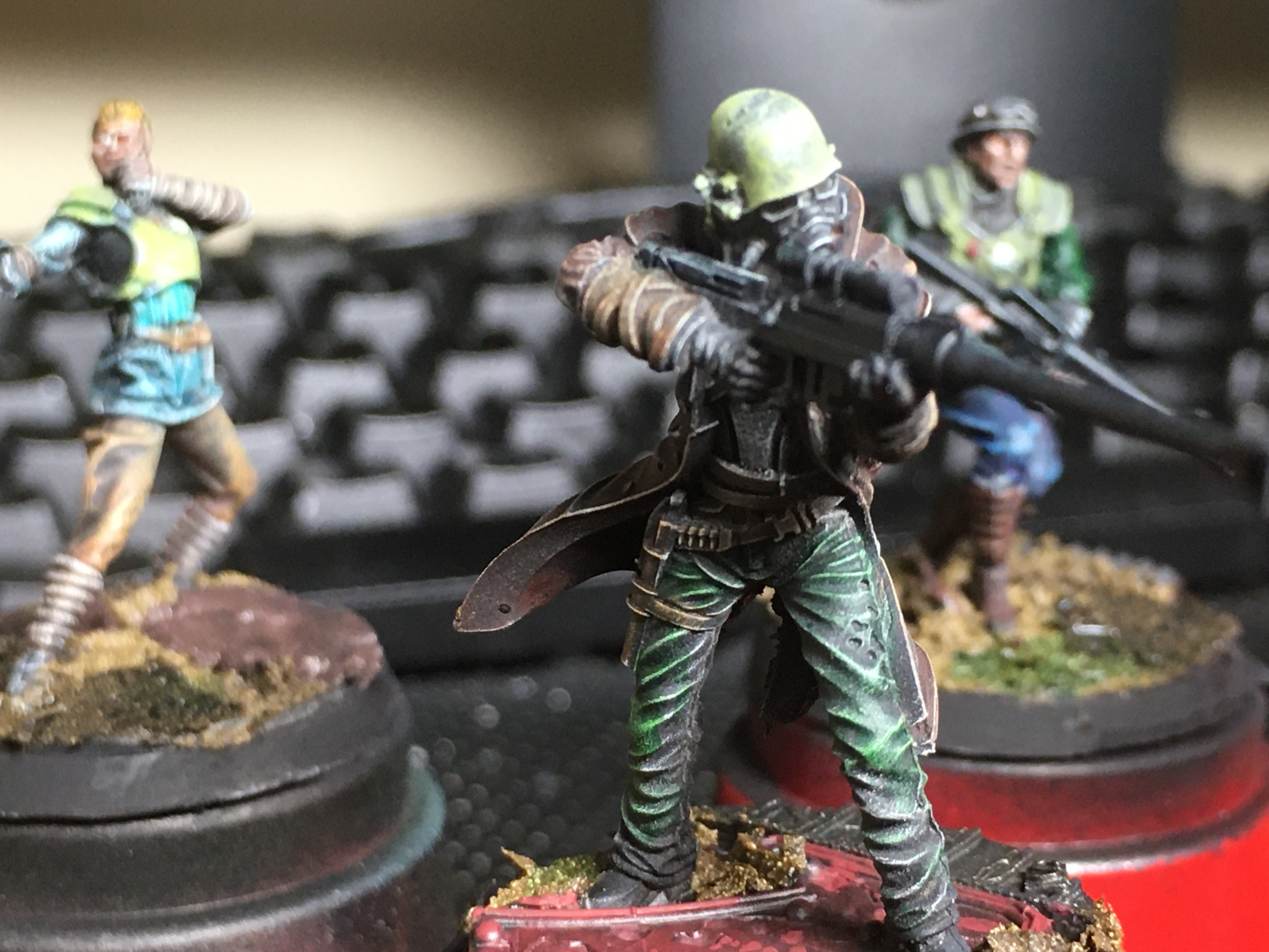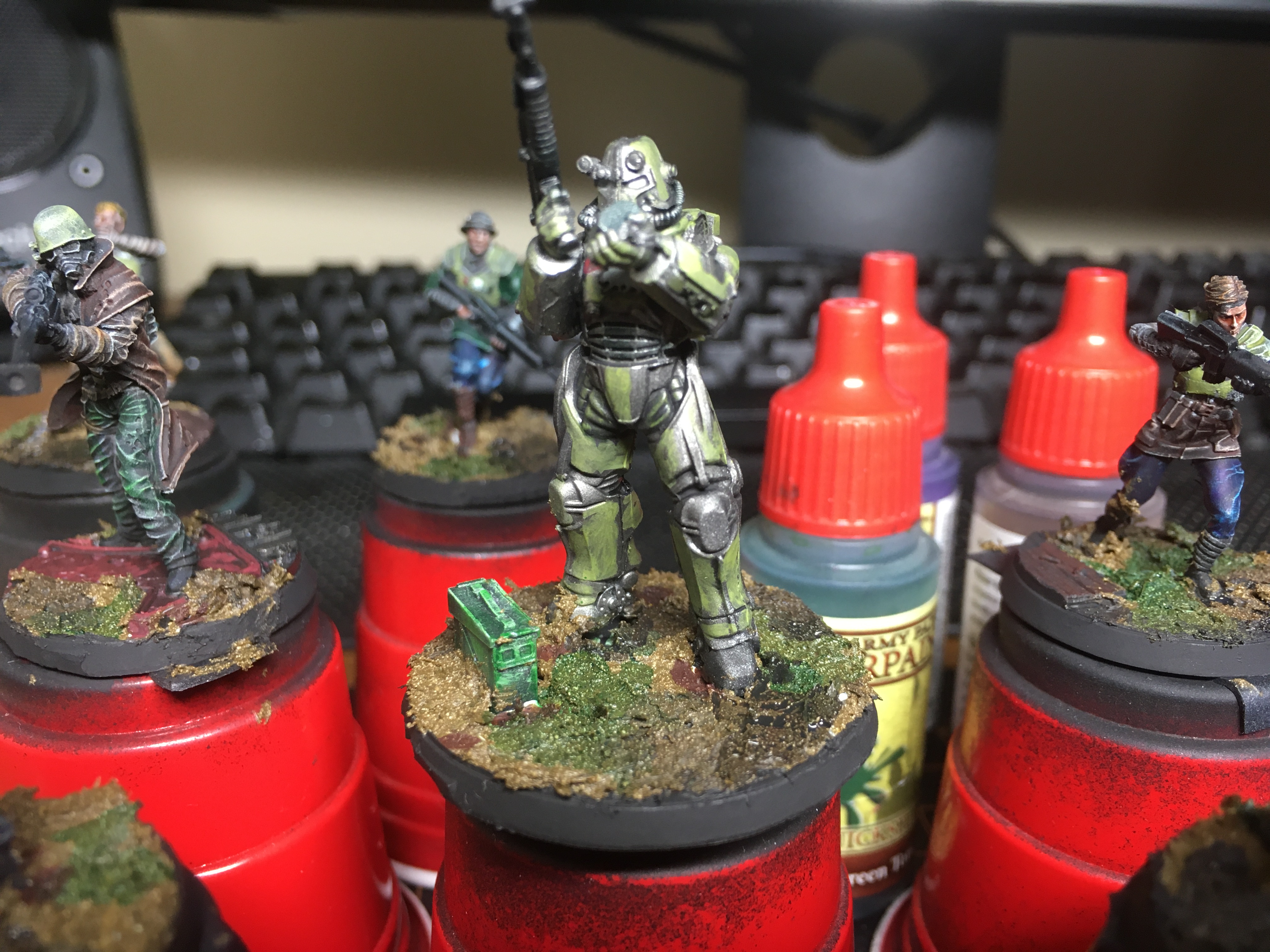 This is a New California Republic force from Fallout: Wasteland Warfare. In case you're unfamliar, this is a skirmish level game based off the Fallout computer games by Bethesda. I purchased these miniatures within the last few months and decided to finally get around to painting them. I tried a combination of regular painting in layers with the new slapchop method that the kids are into these days. I say new, but slapchop has been around for a while. Basically you have a dark base, dry brush a lighter color over the parts that stick out, and then put on a transluscent layer which automatically applies dark and highlighted areas in one go. It's not likely to win me any contests, but when you want to paint a lot of miniatures in a short period of time, it's good enough for table top standard.