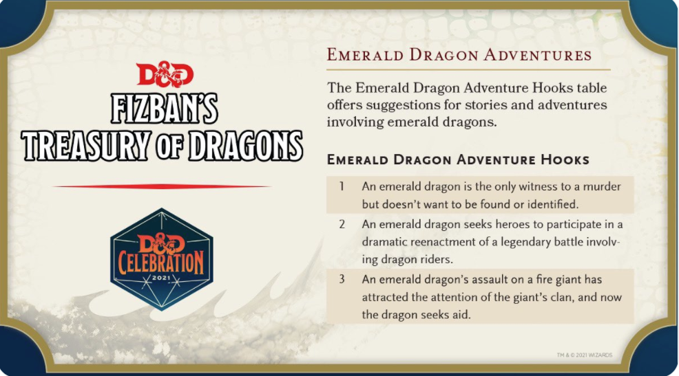 WotC has been sending out previews of Fizban's Treasury of Dragons, due out next month, to folks on Twitter. Amongst those are art pieces and other items.