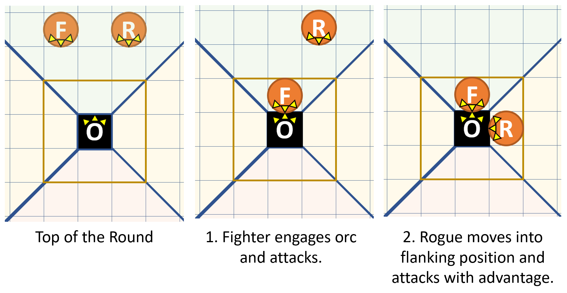 - The rogue then moves into the rear position (red) to attack with advantage as an unseen attacker since the orc cannot turn again.