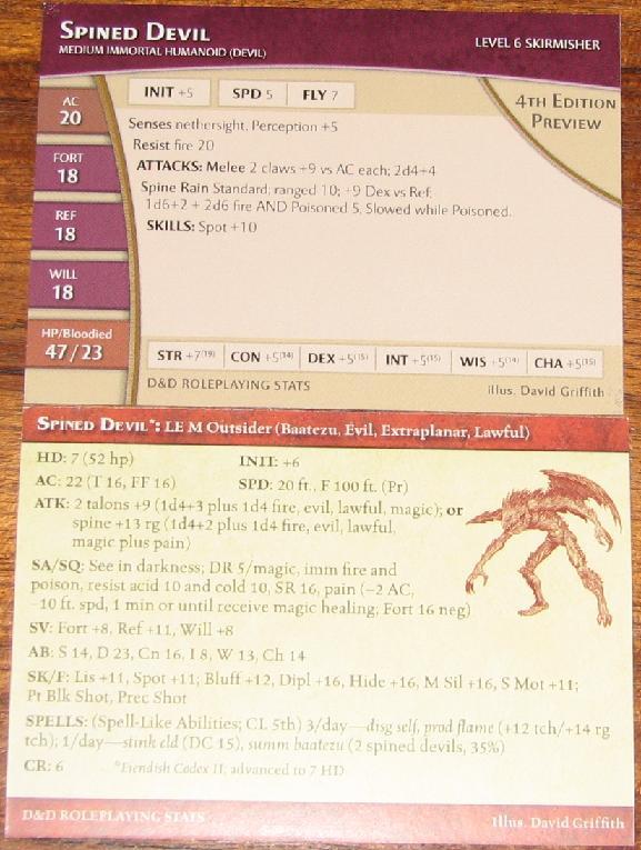 -I just can't agree with you on the speeding up battle thing, sorry. I was a little skeptical about that too, at first, but there are some improvements that have been made that are just brilliant. Check out the new stat card for the spined devil to see a comparison between the 3e monster and the 4e monster. Perhaps this will give you an idea of the differences being made.