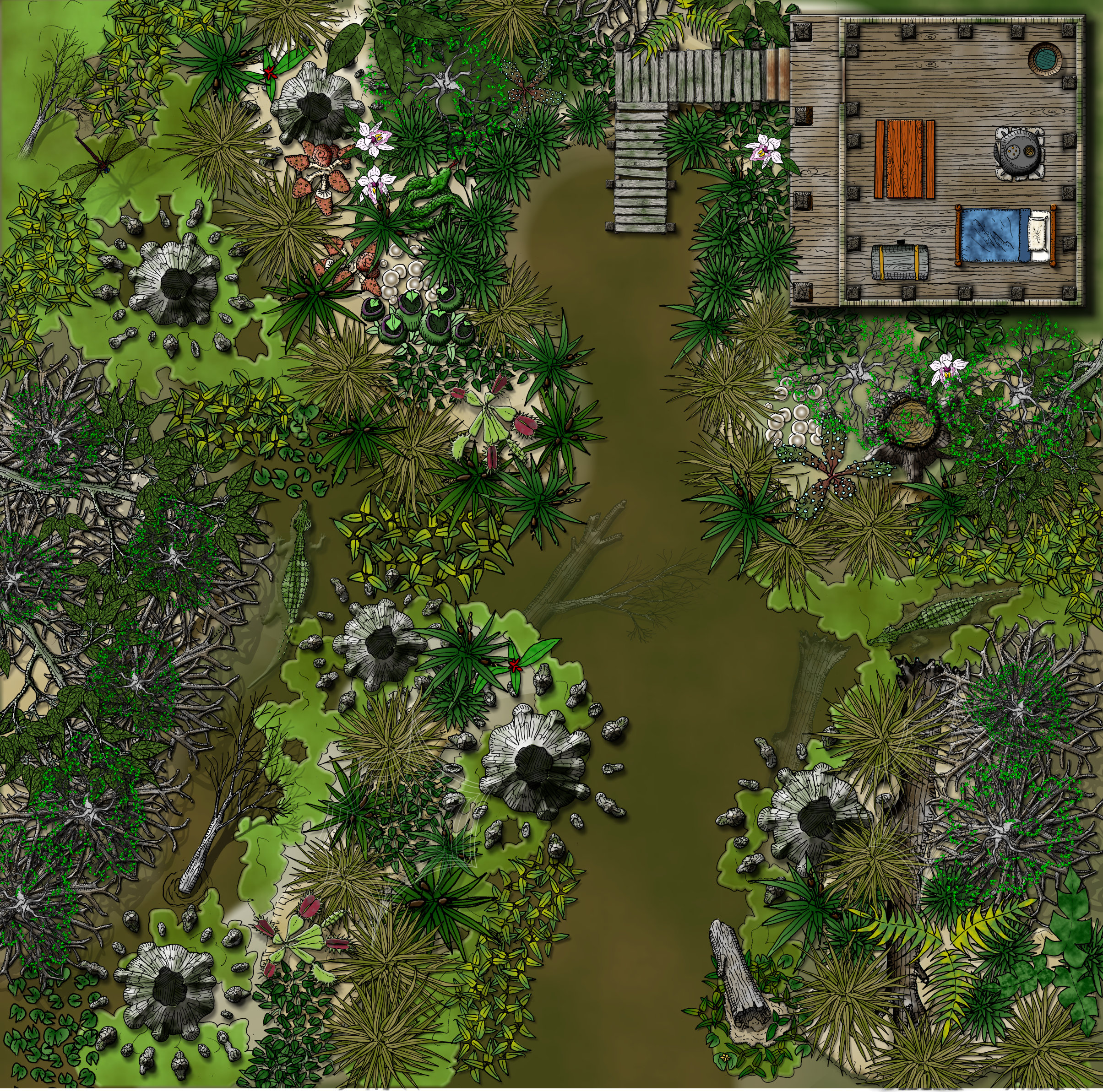 Finished the hand-drawn swamp map by adding a small, undefined cabin. It could be a hunter or poacher hut, an outlaw hideout, a swamp witch's hovel, a druids home, or anything you want. Everything is hand-drawn (as individual objects), then finished in Xara Designer Pro 9 with bevels, shadows and transparencey... Enjoy.