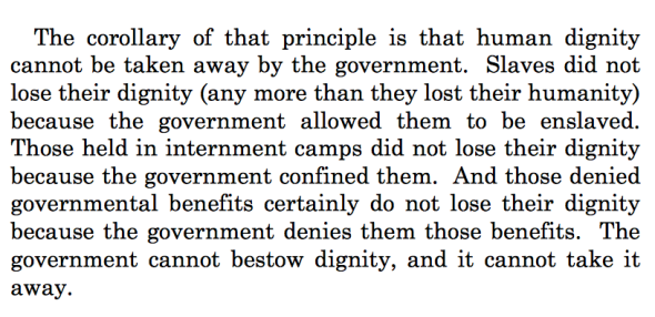 Then, a camp cannot take away a persons right to dignity, although, it does take away their dignity. I'm thinking that Roberts is interchanging "right to dignity" with "dignity".