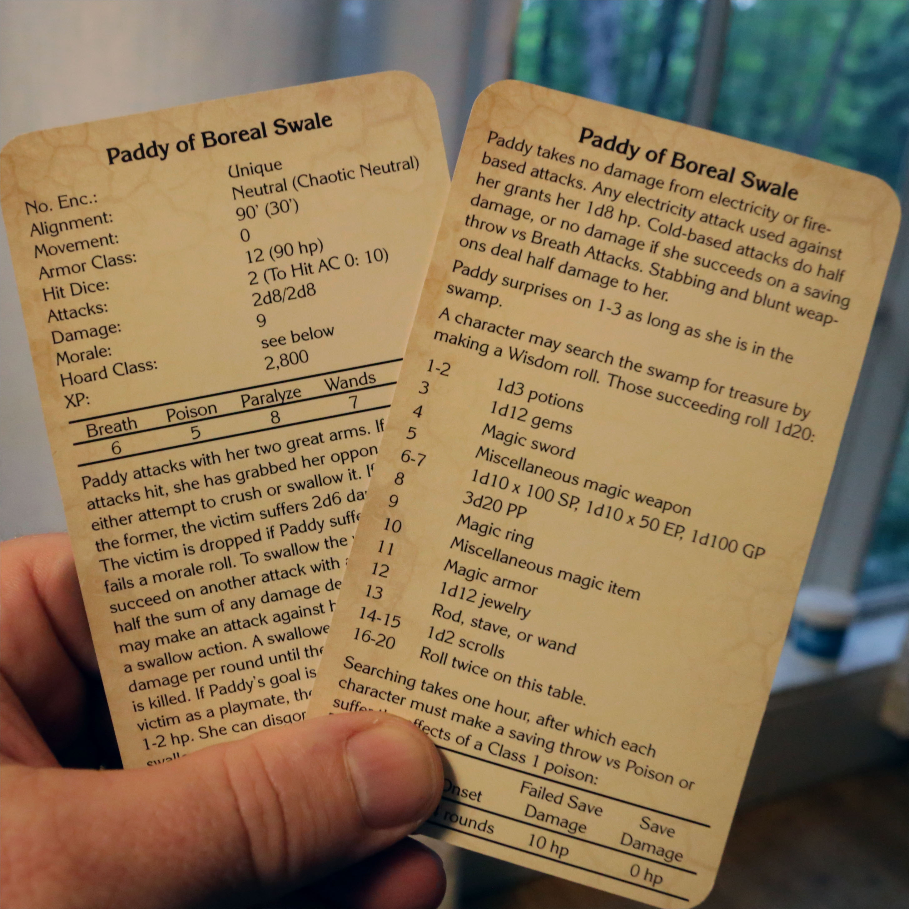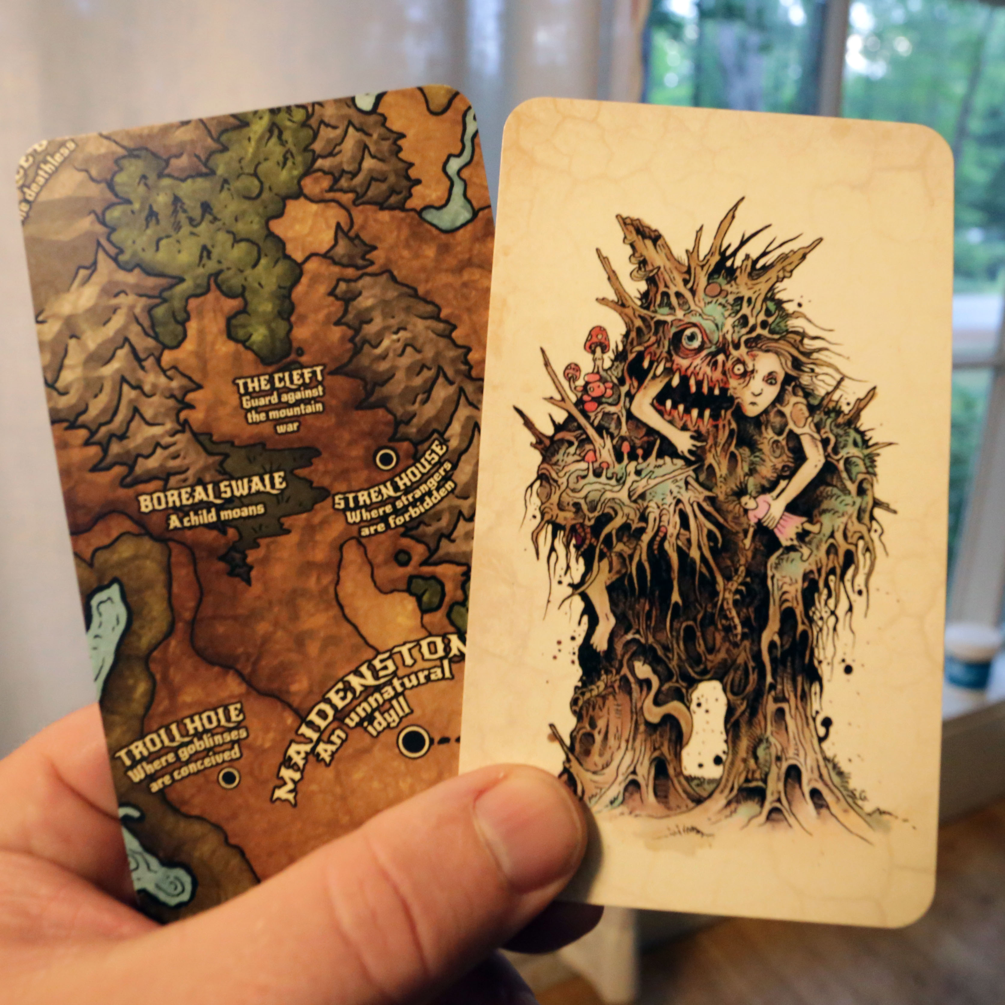 I'm moving closer to launching my new Kickstarter campaign, a monster & region guide called "Gazetteer of the Grotesque." It's for OSR and 5e games. Here are some pics of card & map proofs. Each monster has two cards; stats on one side of each card and a picture of the creature and location of the creature on the other sides. I'm very happy with them!