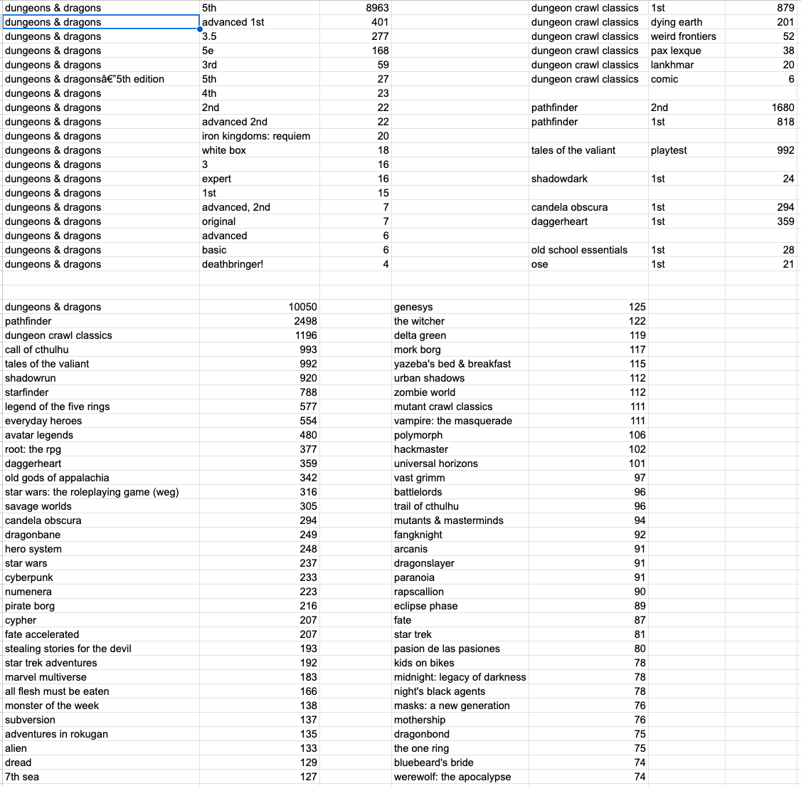 Those can be combined even further. There's probably no difference between "dungeons and dragons 2nd" and "dungeons and dragons advanced 2nd", ditto for 1st and advanced 1st, etc. 5e is still listed three different ways. And so on. The overall numbers add to something like: