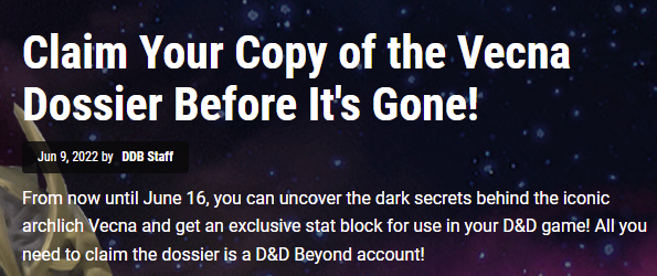 WotC is offering a free product which you can claim by signing into D&D Beyond, including Vecna’s 5E statistics.