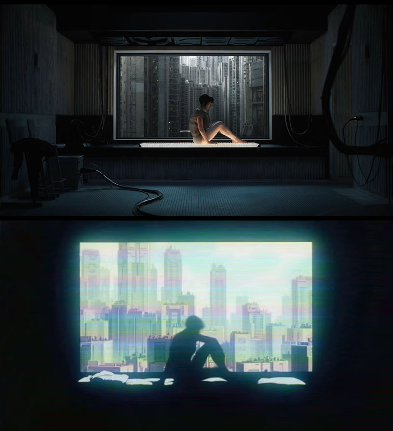 Stylistically though, I think the animated version looks way better. The high contrast reduces the Major to a silhouette (which may be packed with symbolism), while the slow building soundtrack enhances the feeling of emptiness and loneliness. The scene even holds on the window for a very long time, while waiting for the Major to get dressed off screen, and then leaving for work. It is a work of art.