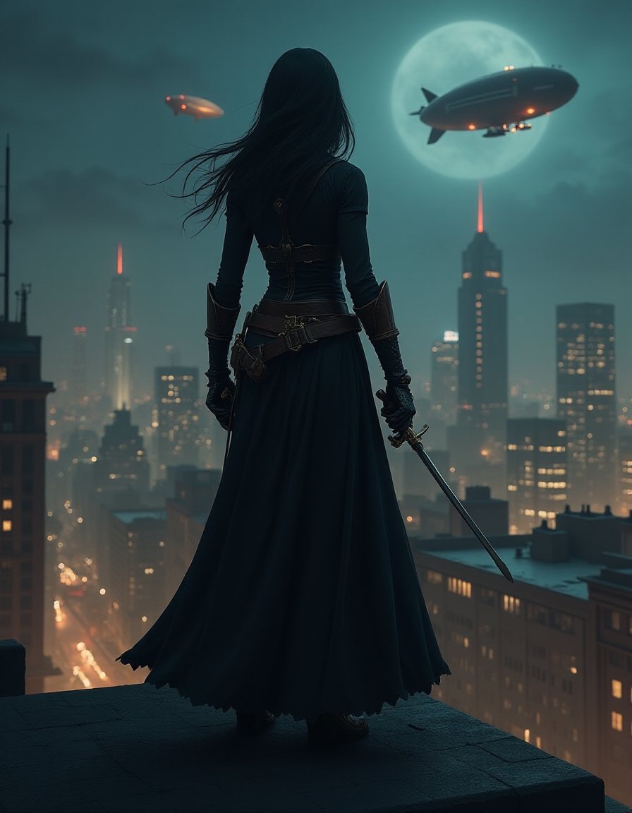 Realistic female Steampunk themed assassin standing on a rooftop at night with a metropolis in the back ground and airships in the sky