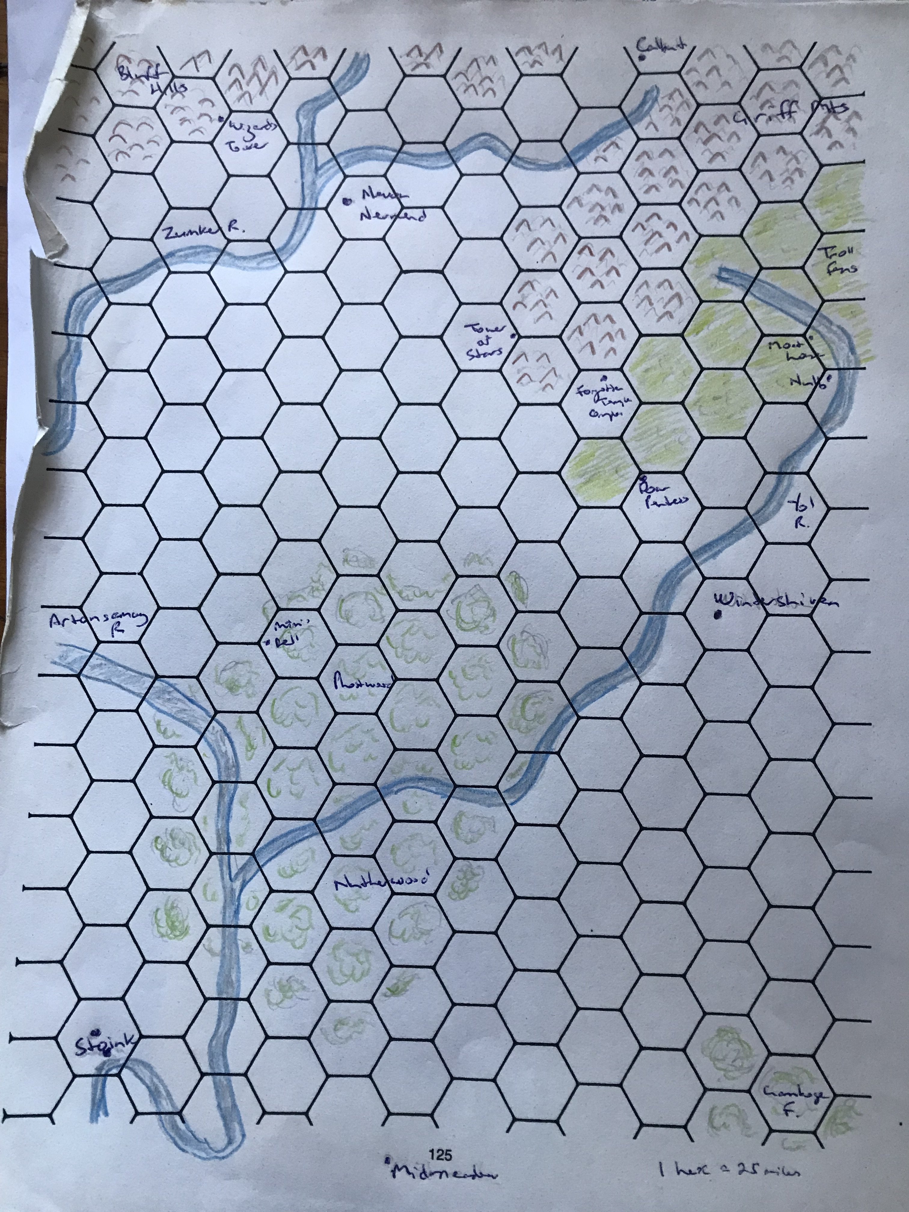 When the PCs move from place to place, I pull out my map and we all look at it to identify where the PCs are travelling to and from. Of course, in our imaginations the PCs are trudging through the Troll Fens, or sailing down a river in their jury-rigged raft, or whatever. But at the table what we're actually doing is consulting the map.Yesterday afternoon I did my first campaign mapping for a while (since I wrote up star maps for Traveller).