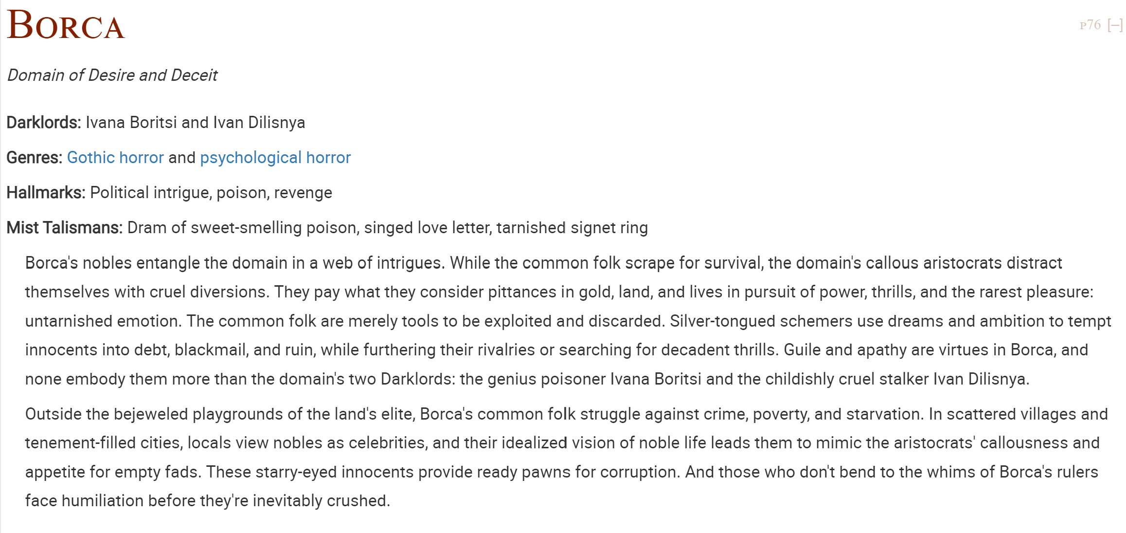 (Oh, and the reason the percentage population matters is for the Heroic Chronicle in the Player Creation section. You can roll to generate random NPCs and characters using that information.)