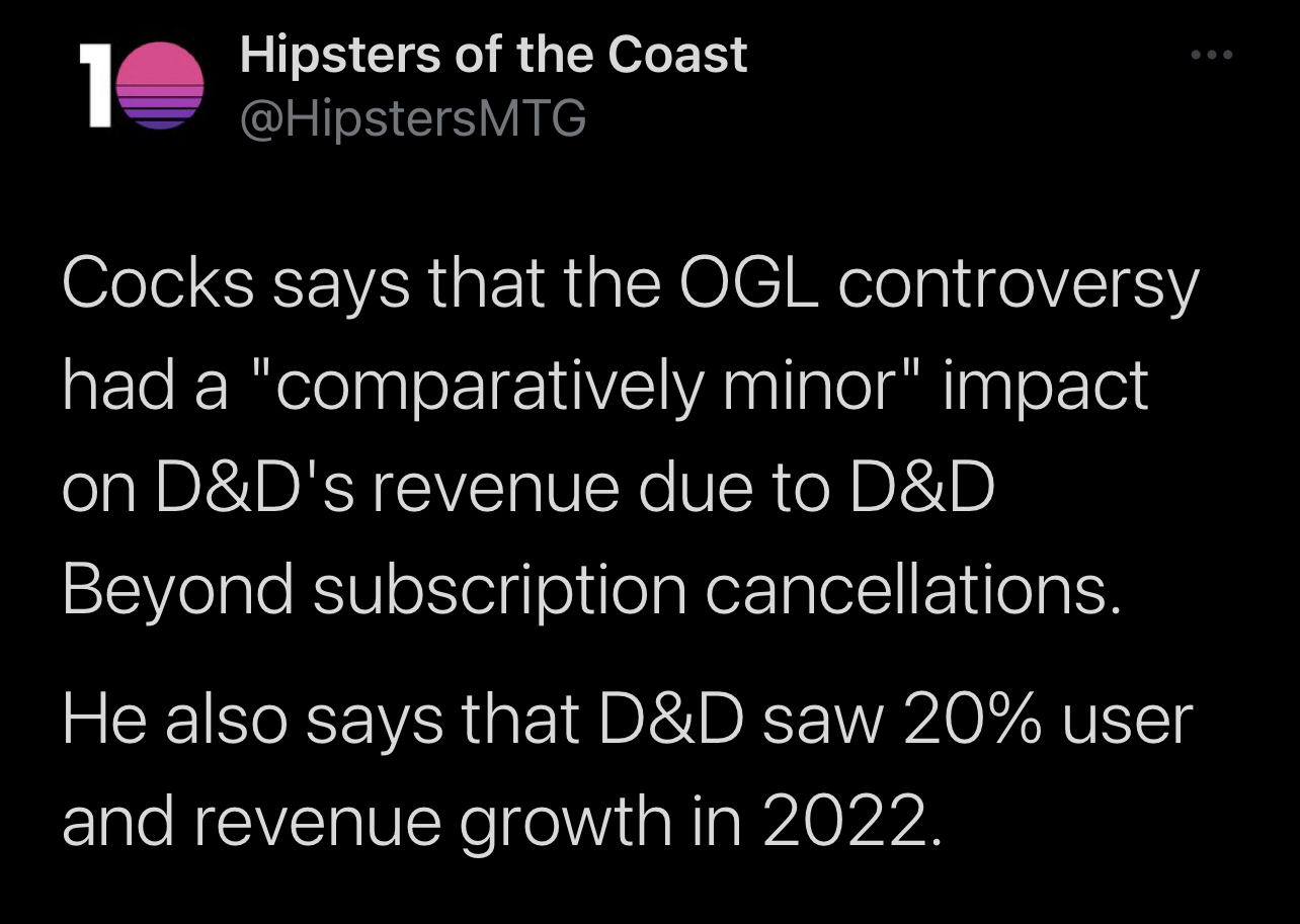 Hasbro held a quarterly earnings call recently in which CEO Chris Cocks (who formerly ran WotC before being promoted) indicated that the OGL controversy had a "comparatively minor" impact on D&D's revenue due to D&D Beyond subscription cancellations. He also noted that D&D grew by 20% in 2022 (Magic: the Gathering revenues grew by an astonishing 40% in Quarter 4!)