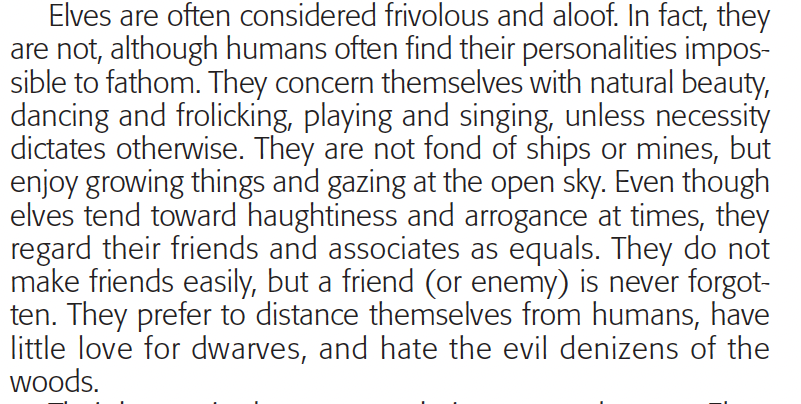 I like the 2E lore, but I think the main thing is it is more interesting to keep half elves as a racial option at the start of the game. Honestly one of the things I think weighs down many of the later editions when you compare them with stuff like b/x and AD&D is there is so much lore in sections of the book that really are about making a character. The lore can be more relegated to things like setting books and the game works fine. When I read 5E for example, one of the reasons that I lose interest (and I have nothing against it as an edition) is the lore in the character section. It just doesn't really appeal to me (and there is nothing particularly wrong with it, I just don't get excited by it). If it were presented more like the 1E classes and races, I could find whatever flavor I want in them (and it would be a faster read I think). So I do think there is something to be said for a more neutral approach. There is something to be said for the brevity in that edition (at least when it comes to stuff like character creation options). Don't get me wrong the entries aren't just one paragraph or something, but I think they take up like maybe a page column of text or a quarter of a column mostly and they almost exclusively focus on class abilities and limits.