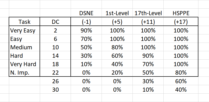 Using the table values. A very easy is DC 2, which the DSNP guy would fail 10% of the time. Sure, it is very easy, but they have no ability to support the task nor proficiency. Looking at the rest of the task levels (with total modifiers):