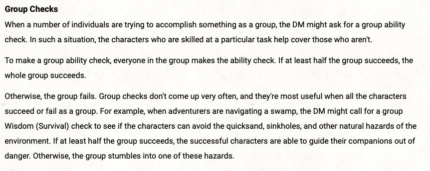 I do prefer to use DMG group checks when possible; it's the teamwork-iest version, gives the specialists a chance to shine a bit, and keeps one bad roll from ruining everything.