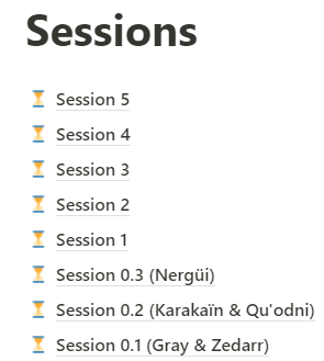 Now, if we dive in one of these, you'll see the notes I actually use for my session. It's basically some freeform notes and a ton of links towards pages scattered through the databases. I can simply open them, close them and I'm always in this session page. So, the first thing in my session page is some links.