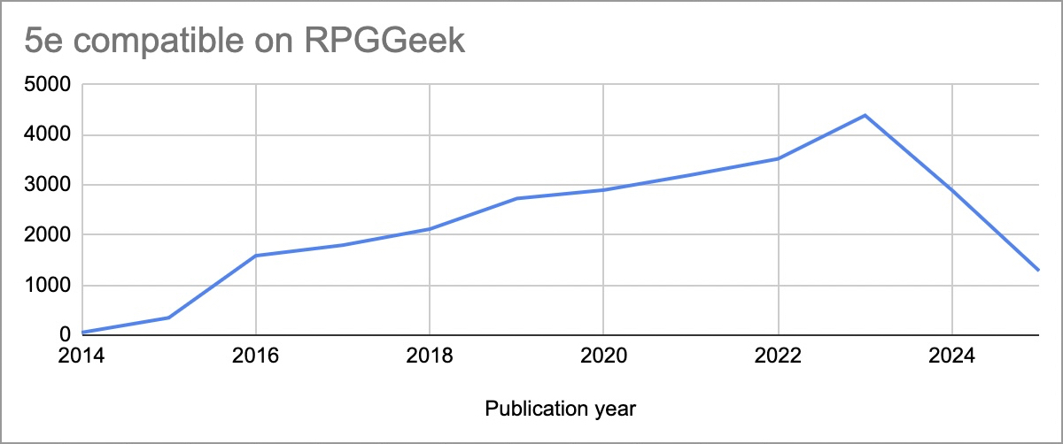 I wonder if the drop also might have something to do with the fact that there are so many alternative D&D games on the market now, all drawing from the 3pp pool. Is, say, ((and this isn't flinging poo at all, it's an honest question)) a supplement for Level Up considered a "D&D" 3pp supplement? Or something for one of the umpteen other D&D adjacent games that have proliferated in the past couple of years?