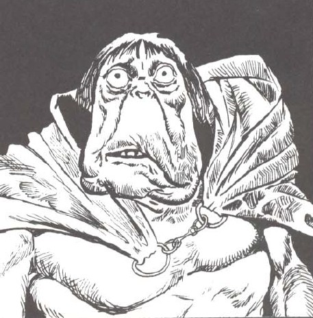 "In the clearing ahead, you see a pair of 9' tall humanlike figures. They seem very thin and have minor deformities- one has an obvious club foot, and the other's face looks like it's partially melted due to a malformed jaw. They wear furs and hides with pieces of metal armor stitched into strategic places, and wield spears."