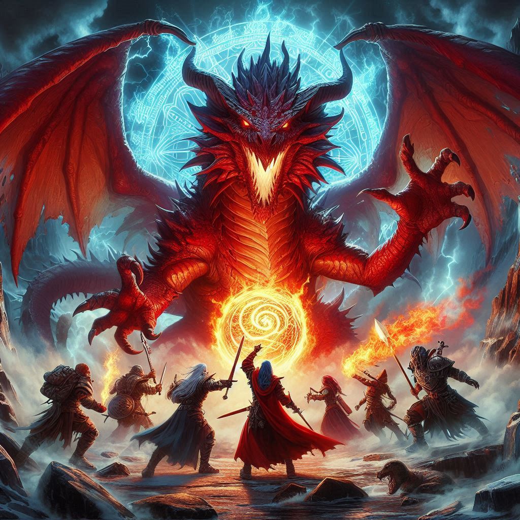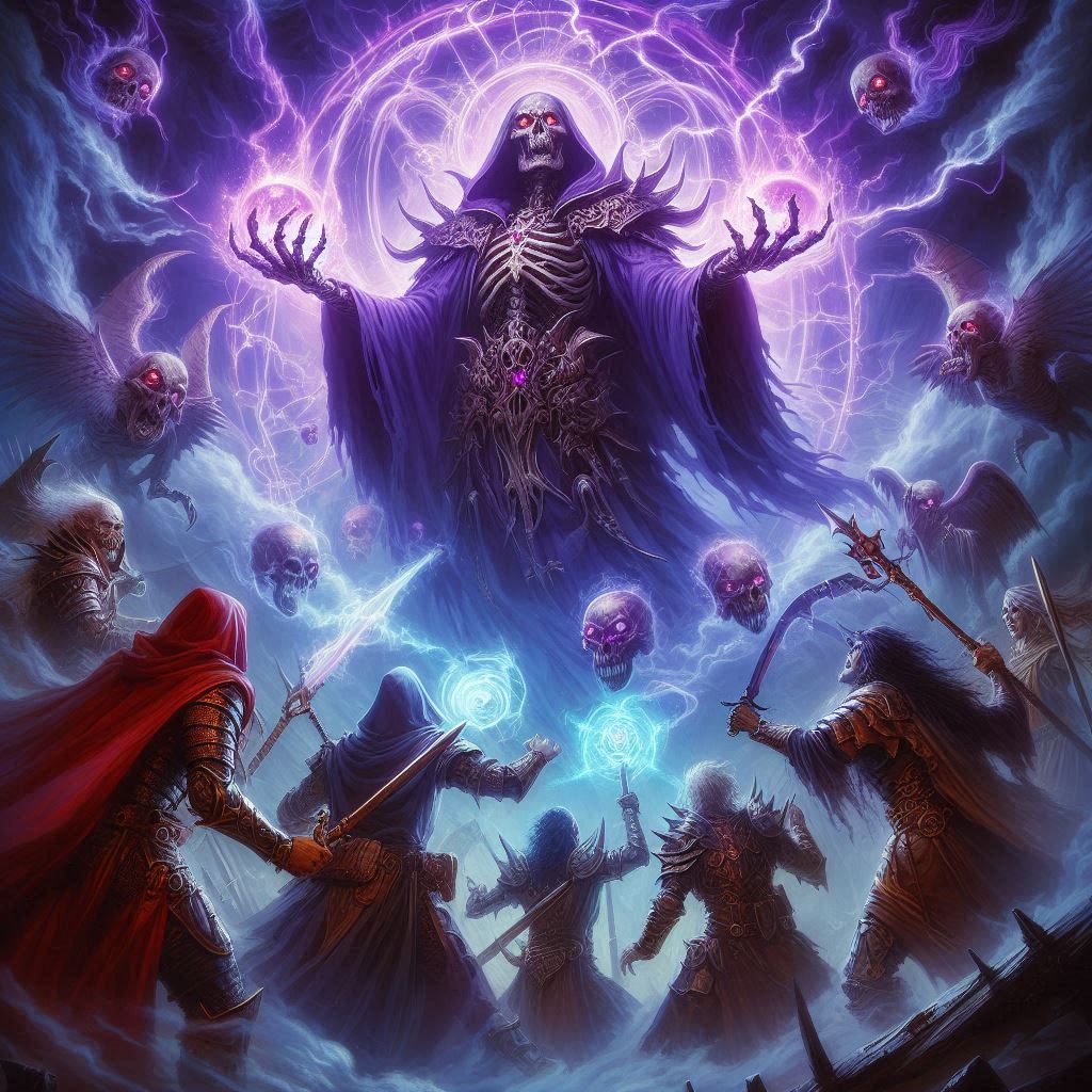 Here we have the evil Lich King astride his Red Dracolich! He is attempting to destroy some meddling adventures consisting of a Fighter blocking a jet of dragonsbreath! A wizard casting an attack spell! A Rogue preparing to fire an arrow! And last but not least a Dwarf Cleric calling upon his deity for aid! Probably in some deep dark dungeon that houses this undead monarch's legion of undead! Just imagine it in full colorful master artist glory, as I imagine it in some sort of 2E style like Elmore or Easley!