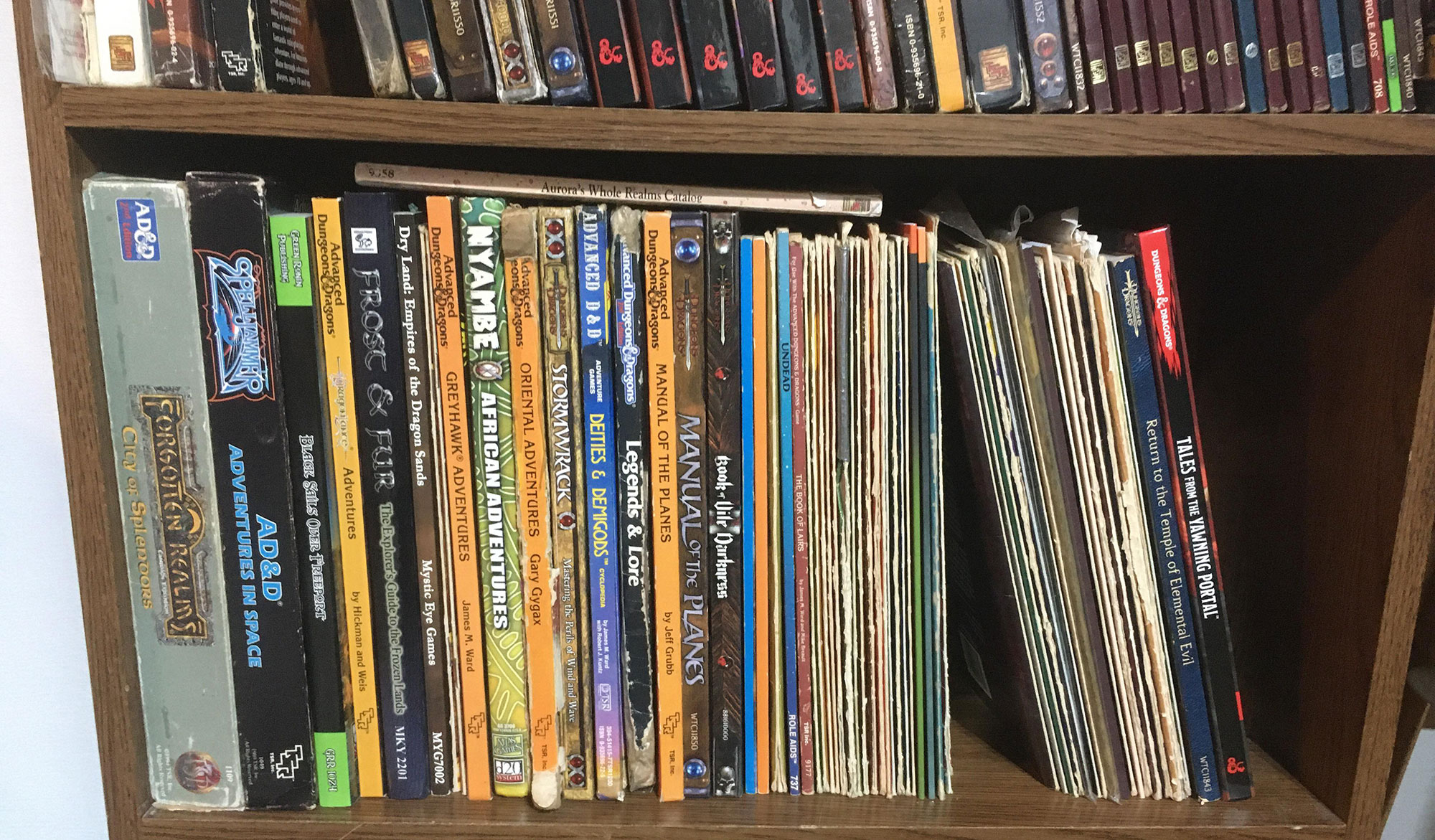 The stuff on the right of the above shelf (btwn the 1E Book of Lairs and the 3E Return to the Temple of Elemental Evil) are (mostly) 1E and BECMI modules. They are in the order of their assigned number code (so B1, B2, C1, C2, S1, UK2, like that).