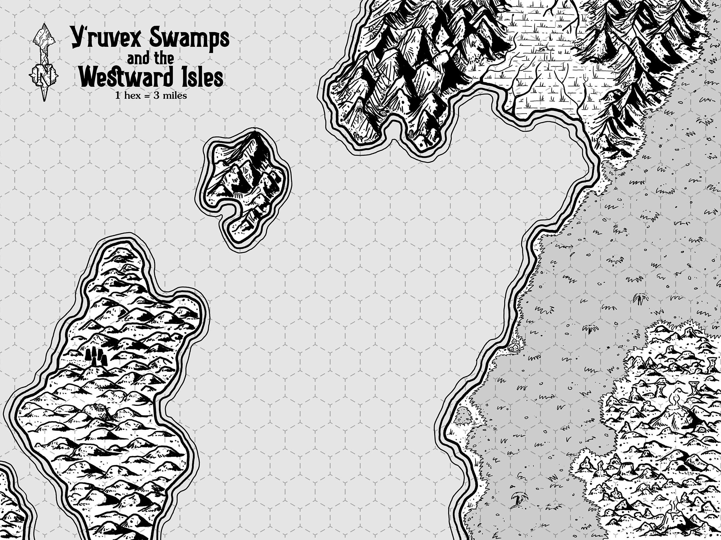 The only major river inlet on the whole of the island is the Y’ruvex Swamps, a marshy lowland pincered between mountain ranges. We believed that if we could get past the swamps themselves and to the open rivers beyond, they would likely lead us to the heart of this island and the rumoured central plateau.