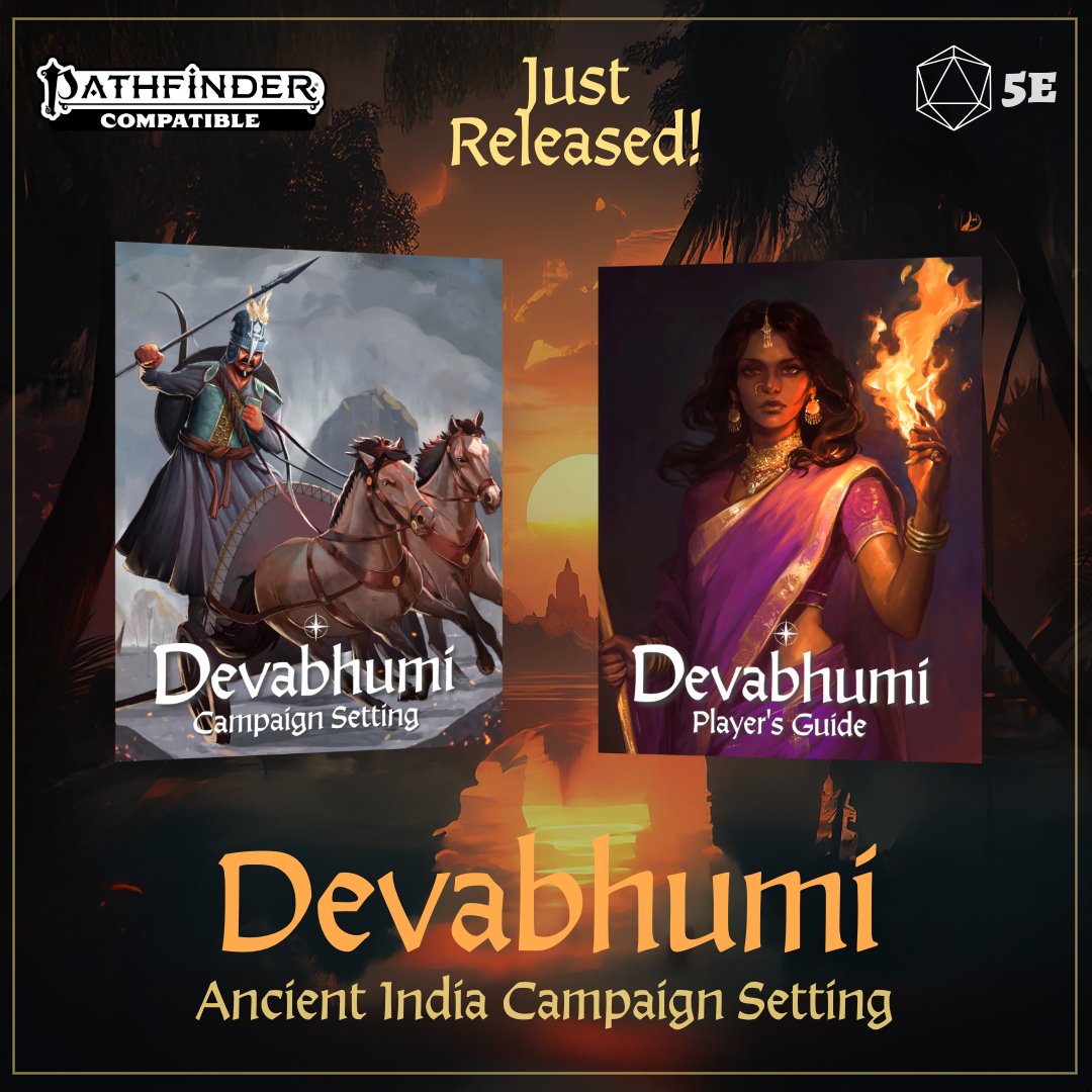 Devabhumi is a campaign setting for 5e and Pathfinder inspired by the myths and legends of Ancient India!