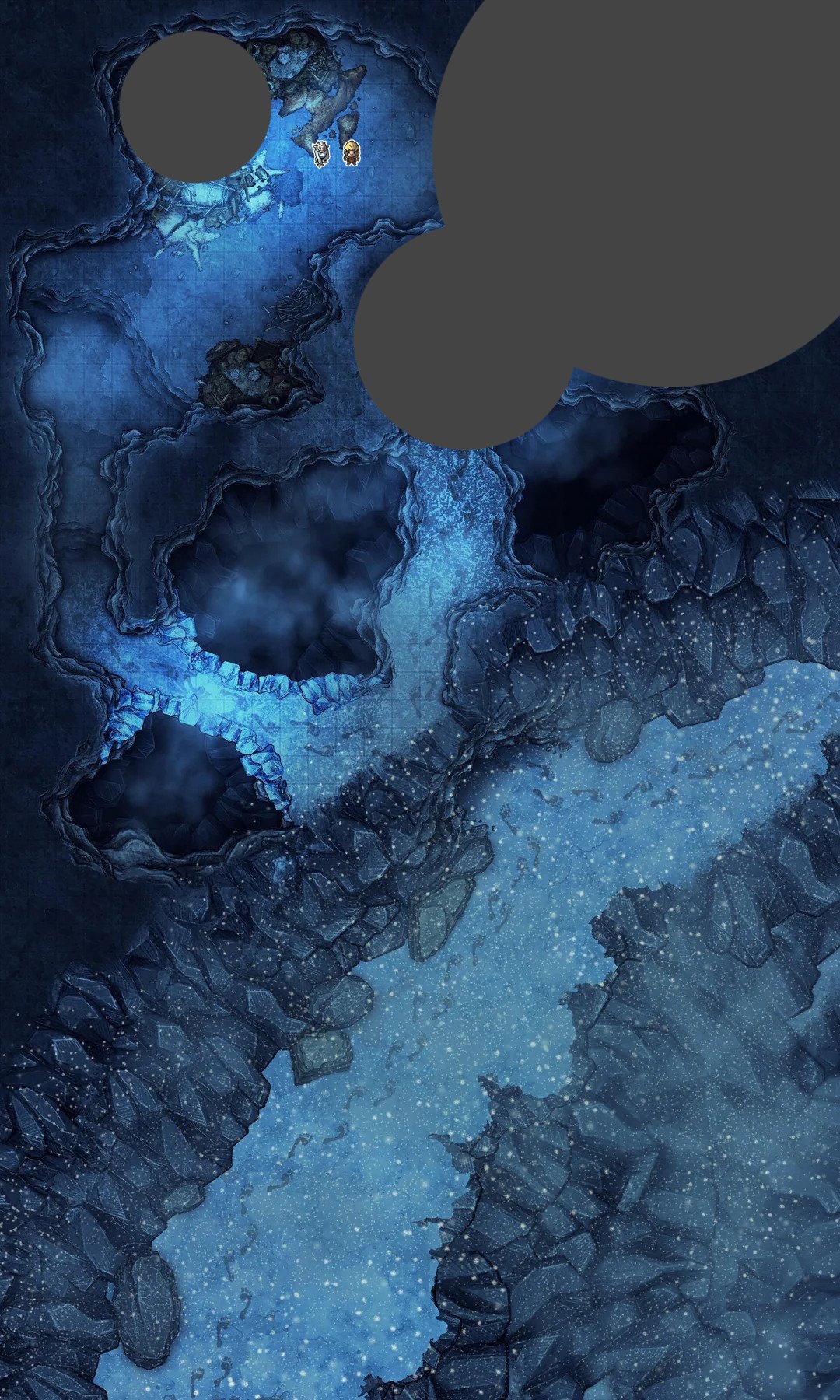 Everyone has gathered into the cave below the 10-foot ice ledge, and can see Lumrolur with his crampons dug in, peering over the edge.