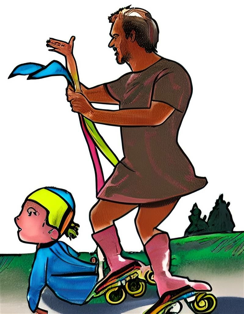 "A middle aged man on roller skates"