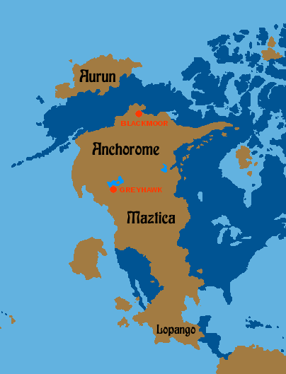If Americas, then Anchorome can work, with Greyhawk on south side of the large lake there?Dunno about Blackmoor but I reckon Greyhawk would fit pretty easily somewhere on the shores of the Sea of Fallen Stars.
