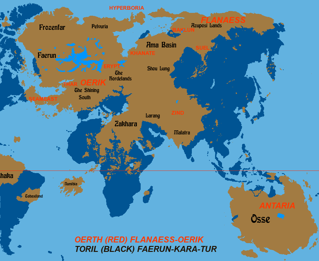 Im considering Blackmoor on the coast of the reallife Hudson Bay, and Greyhawk on the river near the reallife Lake Superior. Whence the Americas. Whence north and south of Anchorome (≈ Canada).That could work: my inclination would be to replace Kara Tur with the Flannaes, however.