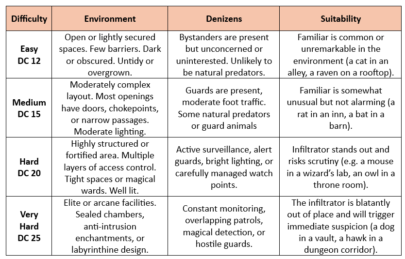 Where something is useful and sensible but not much fun, my gut tells me to abstract the hell out of it. Give the info in a simple and quick way without wasting everyone else’s game time. To this end I present this subsystem for working out how things go when a familiar scopes out a location. Something particularly useful for raids and heists. The rules apply to a familiar infiltrating as much as a polymorphed character.
