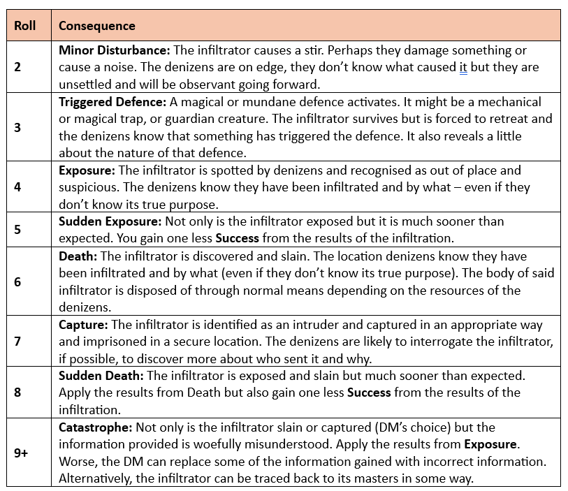 Whenever a mishap occurs the denizens know something is wrong and will be unsettled, even if they don’t know why. For the next 24 hours further skill checks for infiltration in that location are at Disadvantage and during that time guards will be more alert than normal. Add 2 to all Passive Perception stats.