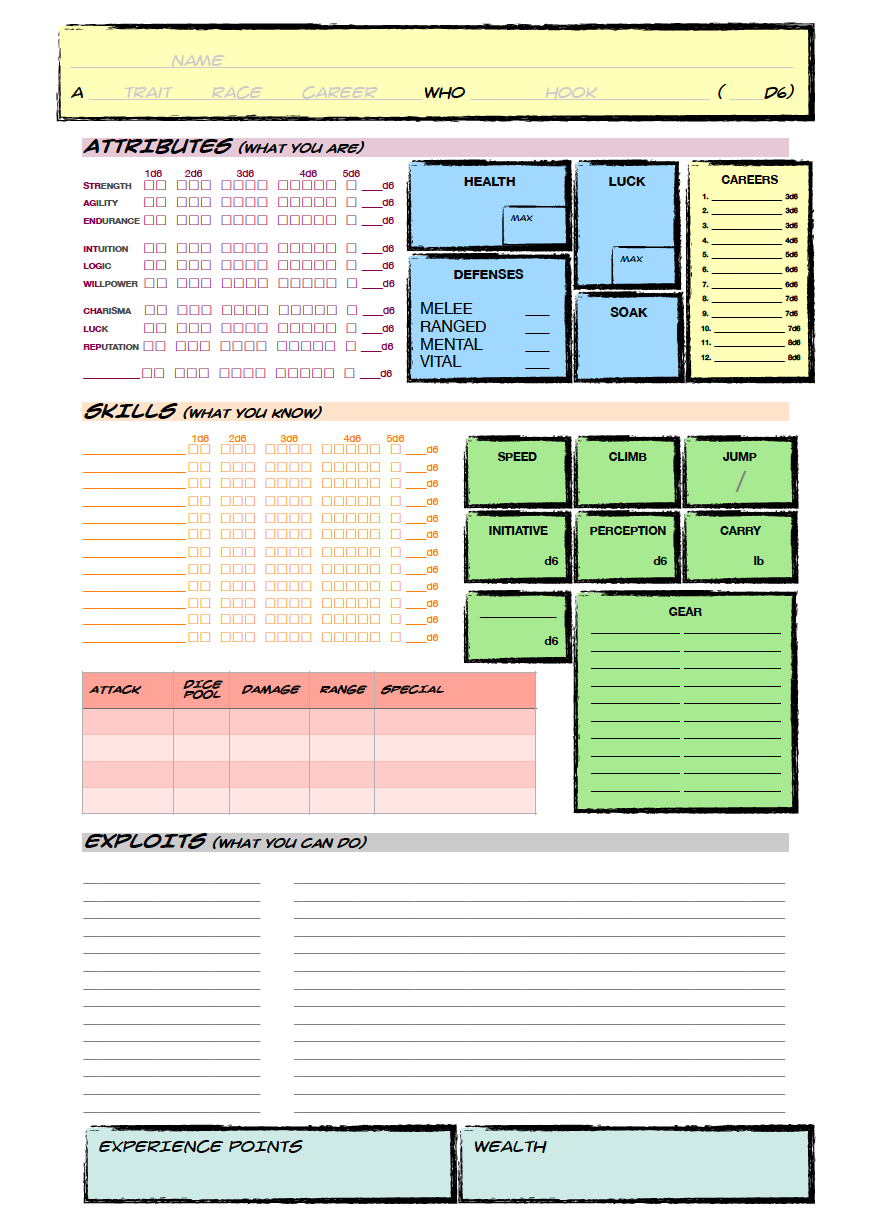 - checkboxes to mark attribute and skill ranks, clearly showing what dice pool you have in each.