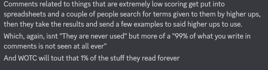 Did anyone actually think that someone (and likely several someones) at WotC was getting paid a full time wage to actually read every single comment, then collate those comments, organize the entire thing, write a report based on tens of thousands of comments (some of which are barely literate because, well, I've certainly seen more than my share of online comments - never minding anyone with second language issues), all within a space of a couple of weeks in order that this feedback would all be taken into account?