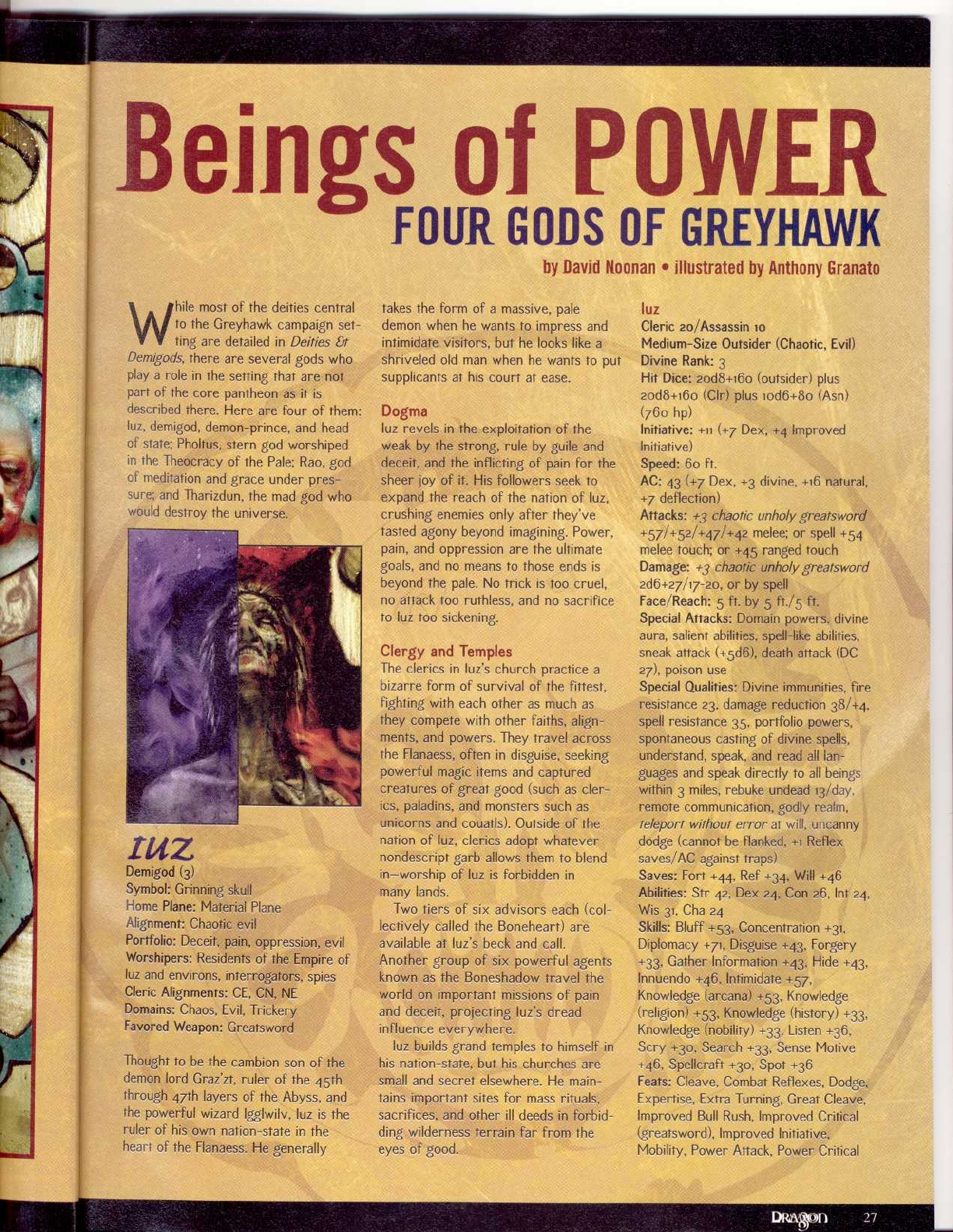 As a demi-deity, Iuz gains a +6 divine bonus to: armor class; attack rolls; checks (ability checks, caster level checks, skill checks, etc.); difficulty class (for any special abilities, spell-like abilities, spells); initiative; saving throws and spell resistance. Iuz’s natural attacks or any weapons he wields, are treated as epic for the purpose of overcoming damage reduction. A demi-deity does not age, requires no air to breathe, no food or drink to sustain itself, nor sleep.