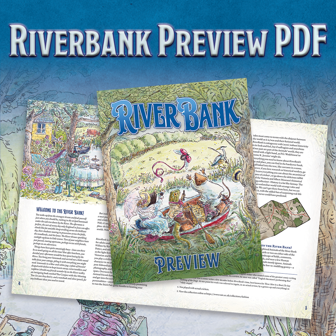 Riverbank is a game about roleplaying, where your character choices directly impact the narrative. Weave farcical or dramatic tales of elegant characters on curious quests as you celebrate friendships, navigate social niceties, and weather the unique dynamics of Animal life. Attend tea parties, stroll through gardens, dance at fancy balls, and win the prize at the village fair—all while trying to keep a stiff upper lip and dodging difficult relatives.