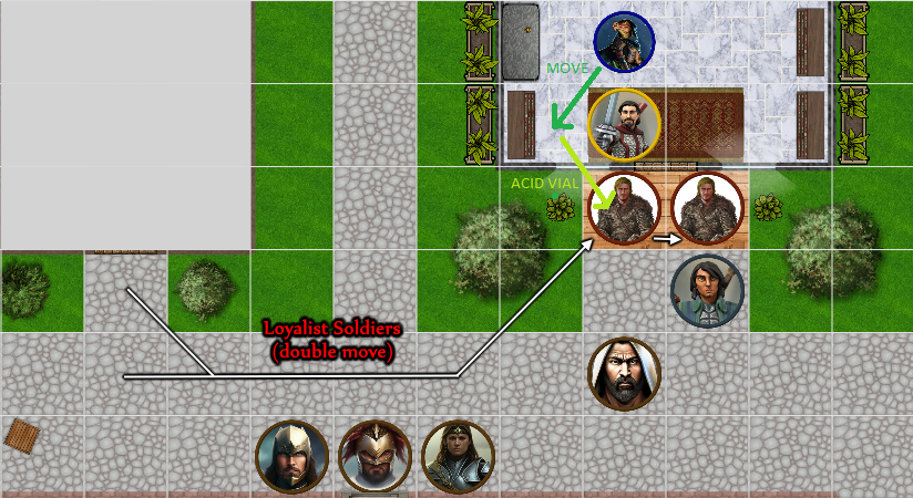 The two Loyalists quickly move from the old house to block the front door of The Crossed Candles. They move with precision and forethought.