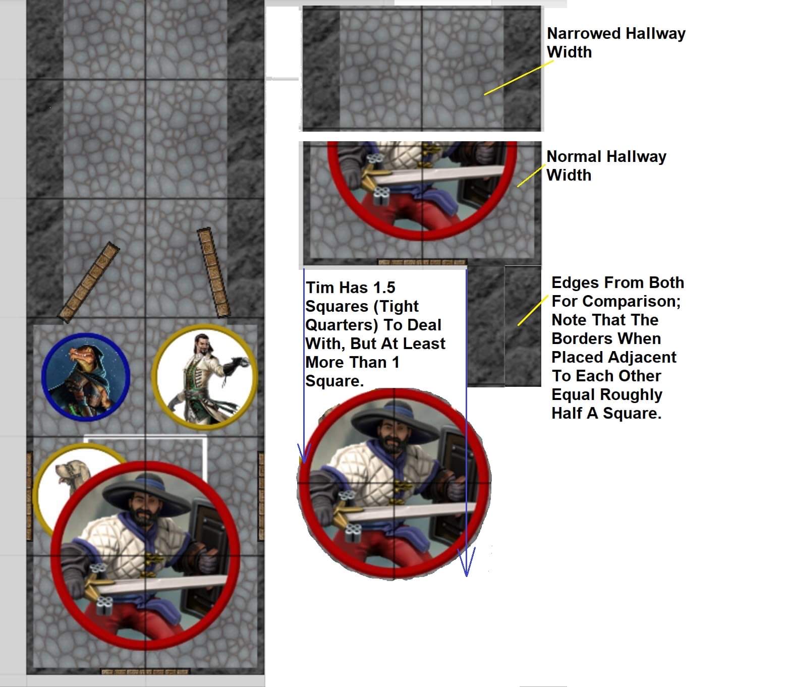 Okay, I have this sense you're trying to convince me that the choke point is wide enough that Tim shouldn't have to squeeze through. For now, he's not in combat, so it doesn't really matter. However, if combat breaks out and he has to go back through the choke point, you will have to use the squeezing rules.@Knightfall Oh ok, those doors were hard to see, but I see 'em now. Related topic: Do you agree with my analysis that the narrow hallway is roughly 1.5 squares wide, as opposed to the normal hallway width of 2 squares? (See spoiler for picture)
