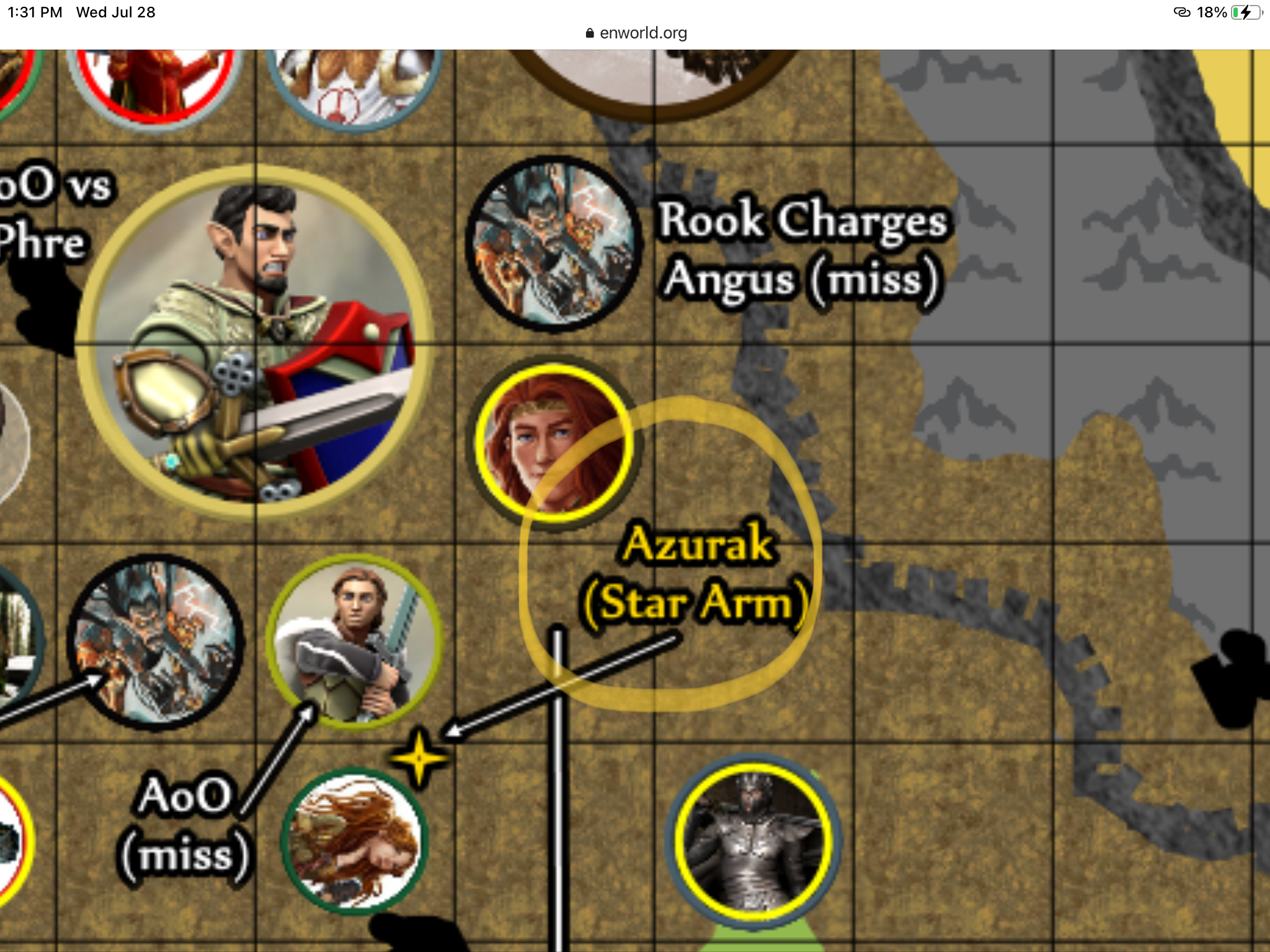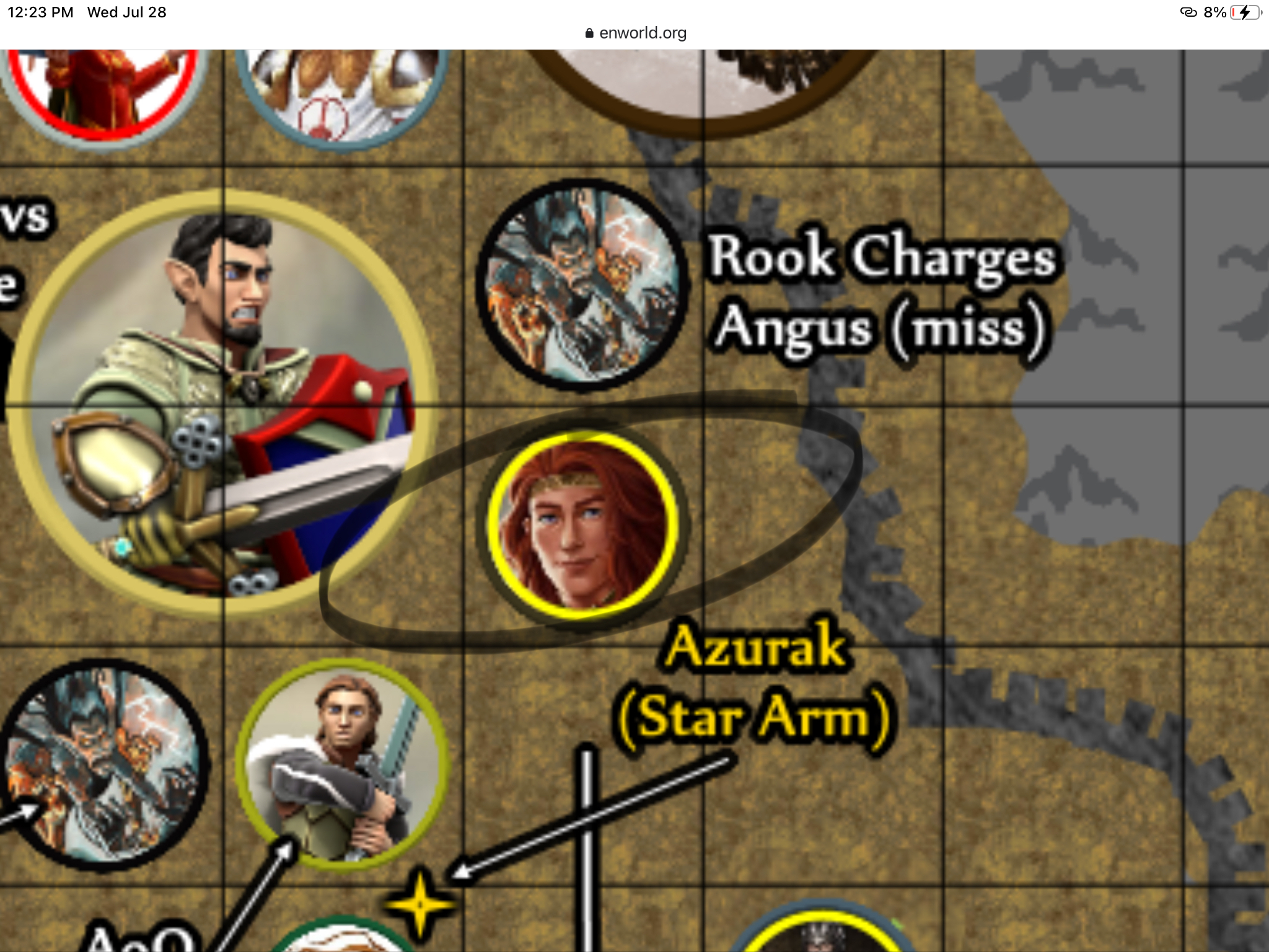 That is the female dwarf fighter who is a militia member (no official name, yet.). She is currently unconscious/dying, which is why she has the yellow circle. Angus will have to be careful to not get too close to the edge of the crevasse, but he can step through her square and Sir Ghal's in order to get to Azurak.Who is this guy? The one outlined in yellow? Is he cowering? Can I step past or through him to grab the star arm?