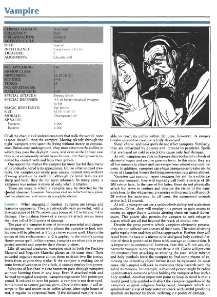 That's a heaping helping of material! AD&D 1E didn't allocate so much space per monster, and so had less overall description, while D&D 3E and later had heavily inflated stat blocks (and combat listings), so they likewise had to tone back the flavor text. It was here, in AD&D 2E, where the monsters were given serious examination not just of what they could do in a fight, but how they fit into a fantasy world.