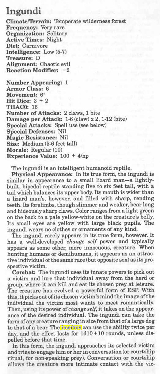 The ingundi used to be called incubus before Patricia Pulling and BADD (...). Fortunately, the staff at TSR proved a tad sloppy in replacing the word incubus with ingundi, so that sages of today still know what the creature should be called.