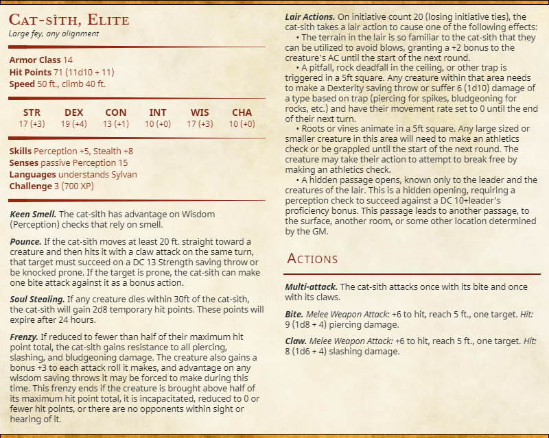 Many humanoid leaders will have additional traits beyond increased ability scores. These available traits are classified into four categories based on the general behavior of the leader: crafty, leadership, survival, and magical. For those traits that force a saving throw, the DC = 10 + creature’s proficiency bonus.